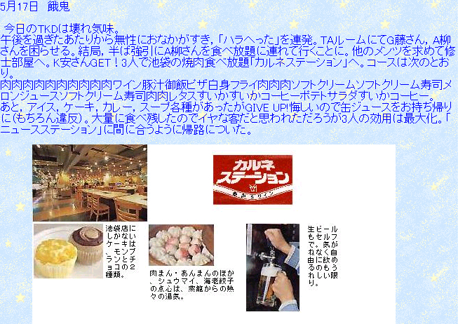 4月28日 でらーうみゃーで! TA激務。 うさを晴らすべく、食べ放題3兄弟(TKD、A柳、H内)でリーガロイヤルホテルのバイキングに行く。 食い散らかし、漁り、ギャーギャー騒ぎながらオーラスまで居続ける(店員、ブラックリストにチェック )。 明日はギタ研の後輩(ブチ&ダーシマ)の結婚式があるので地元の金沢に帰省する。お土産ほし い人はメッセージボードまで。 |