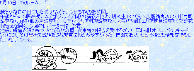 5月13日 研究室飲み会 修士1年生の計らいで森研究室のみなさんと飲み会を開催,会場はすったもんだの末,高田馬場 の「白木屋」へ。顔見せ程度のフォーマルな会かと思いきや,いきなりブレイク。 幹事のK村さんのリードのもととってもにぎやかな満足のいく宴会となる。 2次会はMore Heat Up!収拾がつかなくなるのでは?!TKD内心ひやひや。 要注意人物はつぎのとおり。 K村さん,酒豪!さすが体育会系。&ほめ殺し担当。 KOUさん,お笑い担当。存在自体がギャグ化。 M子さん,外面とギャップありすぎ!○○○キラー。 その他みなさんとてもCharacteristicなヒトばかり。 インテリが多いのかなと思っていたTKDの期待を見事正の方向に裏切ってくれたみなさんに感謝 の念絶えず。今後のキャンパスライフに希望を見出したのはTKDだけではないはず。「これからも よろしく!」心の中で叫びつつ,3次会に行くみなさんを尻目に夜のさかえ通りを後にする。 |