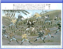 激しく抵抗する犯人を、四本の梯子で取り囲み、間 隔をしだいにせばめて取り押さえた。犯人に突き出 しているのが、捕物三道具といわれる突棒・刺股・ 袖搦。