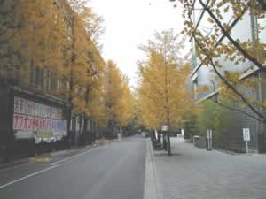 | 晩秋の西ワセダキャンパス。落ち葉を掻き集める清掃員の仕事量は極度に達する。御苦労様です。 |