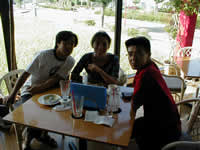 魚津で2人を降ろし、金沢まで一人旅。実家でしばし休憩した後、福井は敦賀からアソびに来たタジと旧交を深める。氏のクルマはベンツ。ナマイキ・・・でもうらやまスィ。ジャスコにジュンちゃんを襲撃に逝った後(不発だったが)、地元にきたらスシだろう、とウン10人が並ぶ"きときと寿司"に逝く。高い皿に気をつけながらも満腹感Get!食欲が満たされたら、さあ襲撃だ、とブチ夫妻を呼び出す。カマトンバの陽光さんさんと照らすテラスで(さぶっ)、ワッフルや1日限定10皿のナントカってのを、昔話・近況を交え、美味しくいただく。