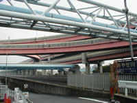 | 隅田川にかかる、新神谷橋からの風景。 | 環七に入り、荒川にかかる鹿浜橋からの風景。前方に首都高川口線が見える。 | どこかのドン・キホーテ。なんかの特売なのか、開店前から長蛇の列。 | 綾瀬川にかかるとある橋の上、パイプやら高速やらでなんだかスゴい。 |