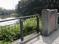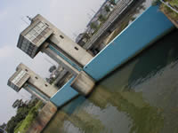 | 中川にかかる飯塚橋からの風景。プレジャーボートやら、ジェットスキーが行き交っていた。このブルジョワどもが! | 水元公園近くの、その名も"こうもん"橋。菊門がムズがゆくなってくるゼ! | どこかの水門。このあたりになると、環七からずれてしまい、どこだかよくワカラン。 | 埼玉のあたりに来たのかな。田んぼが見られるようになってきた。(゚∀゚)タンボキター!!! |
