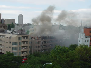 新目白通りから神田川の向こうへ行くのは橋が狭すぎて不可能。近くまで来て現場に行けない消防車、救急車、パトカー、覆面、TEPCO、東京ガスの車両で通りはごった返していた。お隣さんや、同じ階の住人もゾロゾロ出てきて、期せずして普段ほとんどないコミュニケーションの場となる。消火活動がうまくいかないのか、隣の部屋に延焼し、ドン^2煙&火柱の量が大きくなっていった。沿道は野次馬がごった返し、“Keep