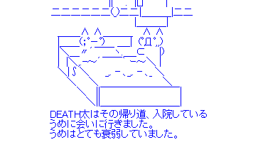 帰省開けて1日目は急遽ばあちゃんに依頼された満期保険金処理を行う。御年84歳でろくに字も書けないばぁチャソに支店まで出て来いだの、自書しろだのメンドくさいことを要求されるが、DEATH太のサポートもあり、なんとかクリアする。それにしても、20mもろくに歩けないばぁチャソの老化振りには少々オドろいた。トシはとりたくないものだ。