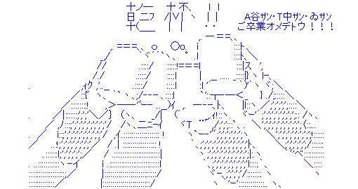 披露宴でカメラ係としてお世話になったA谷&T中氏への恩返しと、今日の学位授与式ではカメラマソとして奉公させてもらった。まずは文キャン体育館で行われた学部、研究科合同のセレモニー、漏れとDEATH太は2F父兄席に逝ったのだが、チョ〜満で立ち見になった(更に後に来た香具師は外でプロジェクター鑑賞となった)。森先生をはじめ、見知りのセンセイ方が例の角帽&ガウンを纏っている。博士学位授与者もソノ身なりだった。経済からは今年度はゼロだった。来年or再来年くらいに出せたらな…なんて彼らを羨望の眼差しで見つめる。