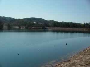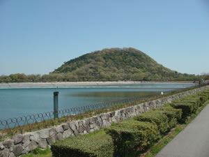 北山貯水池と背後の甲山。たくさんの散策客がいた。 |