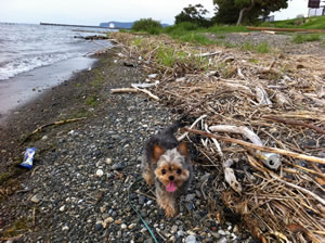 今日のお散歩コースはチト逸脱し、びわ湖岸まで行ってみた。松原のような整備されたところじゃないので雑草や流木、はてはゴミで散歩コースとしてはあまりよろしくないようだ。それでも水はきれいだ。目を離すとちよがザバ^2と湖に突っ込んでいった。恐怖心はないのだろうか?