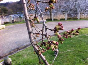 土曜日。朝からマンソンがらみの手続きのため、南彦根まで出向く。その帰り。彦根城周辺では桜まつりで交通規制が敷かれていたため、余計なルートをぐる^2回らされた。そんなに桜が咲いているのかと、午後のうめちよとのお散歩では彦根城の西側、金亀公園まで足を伸ばす。う〜ん、まだつぼみだな。ほんのりピンクに色づいてはいるものの見ごろとは言えない。来週末くらいがベストだろう。