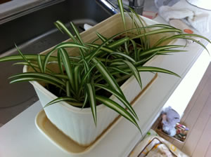 ベッド脇で育てていた観葉植物のオリヅルランが今年もランナーから子供チャソをたくさん生み出していた。そのモサモサ感がだいぶ見苦しくなってきたので、プランターに株分けしようと考える。