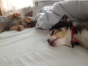 夜ご飯になって、うめさん、急にしょんぼりしだした。この傾向は何度か経験したことがある。食欲がなくご飯を残すパターンだ。予想通り、1口もつけなかった。お腹に耳をあてるとキュ~グル^2と鳴っている。おなかの調子が悪いのかな?お散歩中にヘンなもの拾い食いしたのではないか?と心配になる。