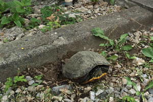 帰宅すると、社宅前の通路でガサゴソと異音がした。ホホに伝う一筋の汗、いや~な予感がした。この音の大きさから虫よりは大きな何かだ。・・・ヘビ?と音のする方を覗くとカメだった。しかも結構でかい!