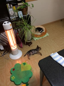 電熱部がオレンジ色に灯ると、条件反射の如くうめちよが寄ってきた。この寒がり共め、トリミングでバッサリ刈られたらどうなることやら。
