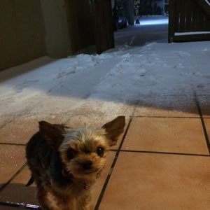 最高気温になるであろう正午くらいを見計らって、うめちよを散歩に連れ出したが、まだ冷蔵庫の中のようだ。さすがにうめは寒がって足を進めてくれない。仕方ないので途中抱っこして散歩する。