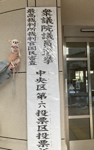 今日はさらに、です太&たまこでまいばすけっと&セブンイレブンへ、たまこだけ連れて隅田川テラスでお散歩に、そしてまたみんなで近所の投票所に出かけた。そう、衆議院選挙だ。投票所はガラ^2だったが、係の方(校務員?)は皆真剣だ。ホント、お疲れ様です。