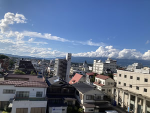 中込市街地の様子。右奥の雲に隠れているのが浅間山らしい